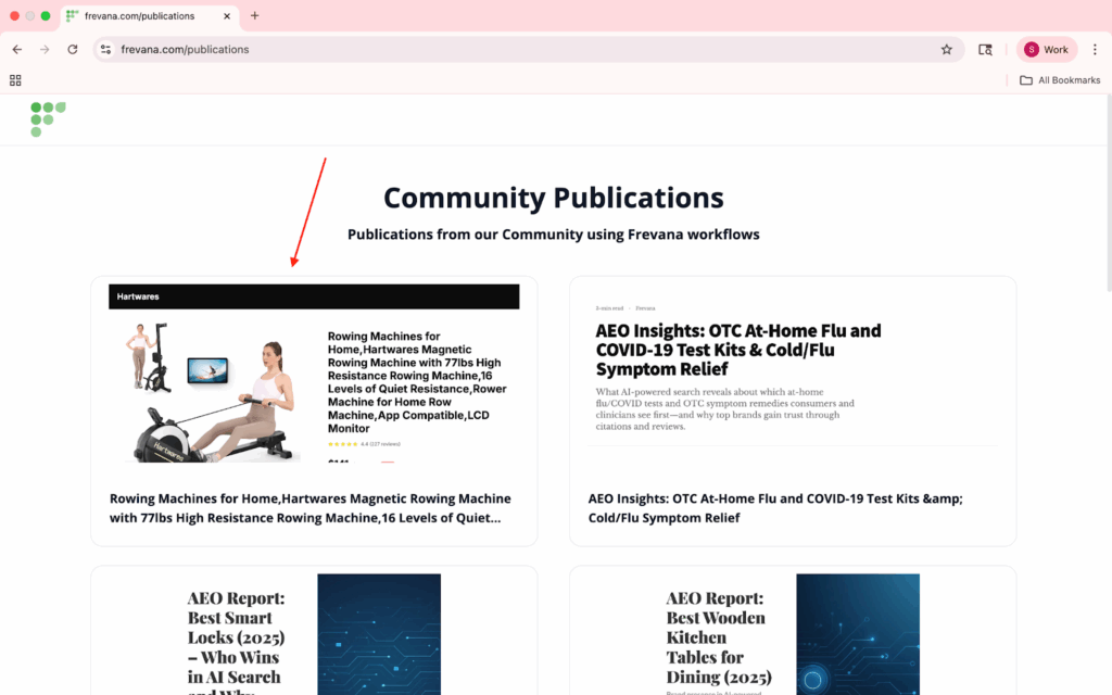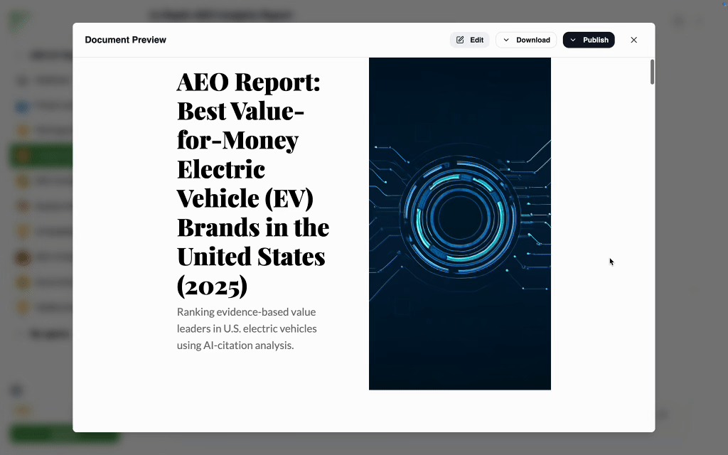Frevana begins with an in-depth industry audit. You just need to type in a question about your product (e.g., What are the most value-for-money EV brands in the US?), and we will generate a report using results collected from ChatGPT, Gemini, and Perplexity. The report includes industry brand rankings, the rationale behind those rankings, competitors’ pros and cons, and brief actionable items. In this report, you can see whether your brand appears in the top list of AI search results. If yes, congratulations, we will work hard to improve your ranking further. If not, don’t worry, we will diagnose the problem and take action to solve it.