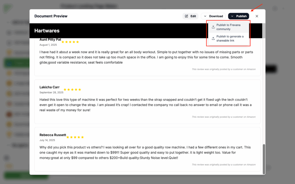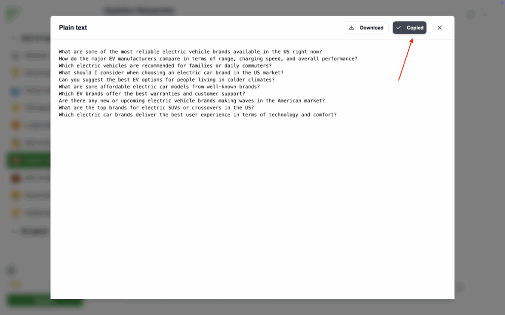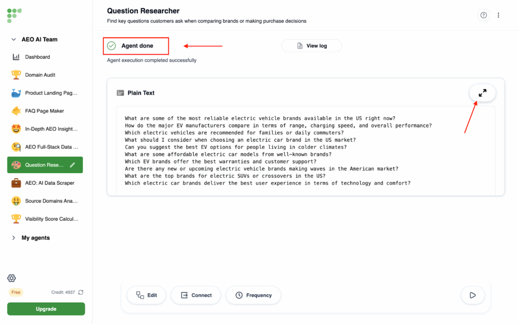 After that, Frevana helps you look for what your customers are really asking. If you’re not sure what consumers are searching for, or if you’ve noticed that people now type complete questions instead of searching simple keywords in search engines, this step is essential. Just enter an initial query about your product (e.g., What is the best camping tent brand in the US?), select how many questions you want, and we’ll generate a list of related queries that customers are likely to ask when comparing brands or making purchase decisions. These questions reveal what matters most to them, whether it’s price, features, or reliability, so you can create content that speaks directly to their needs.