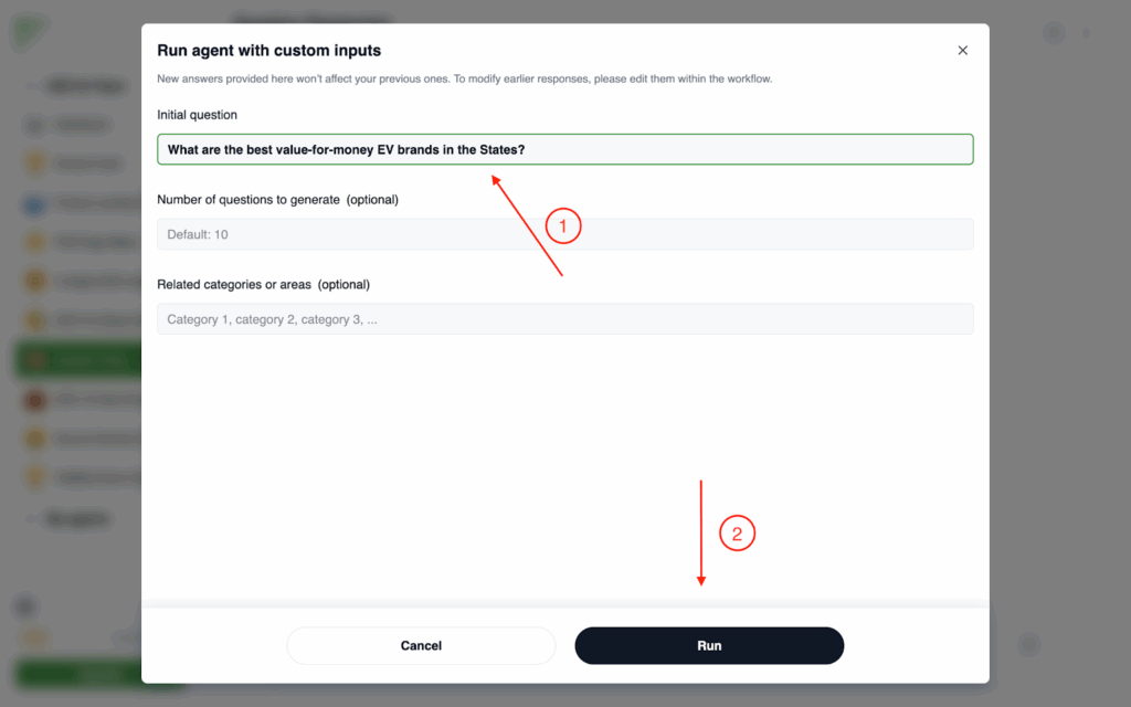 - Then type in the initial question. By that, it means you can type in the question you care about the most. For example, “What are the best value-for-money EV brands in the States?”. Then you can set how many questions you want to generate. The default setting is 10. Then you can hit Run.