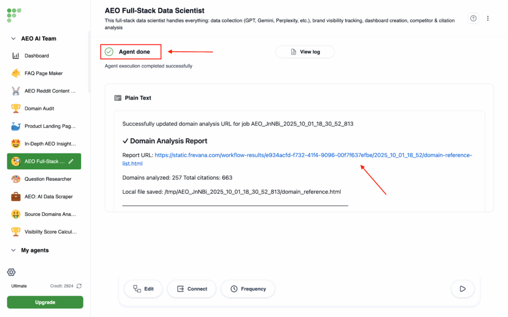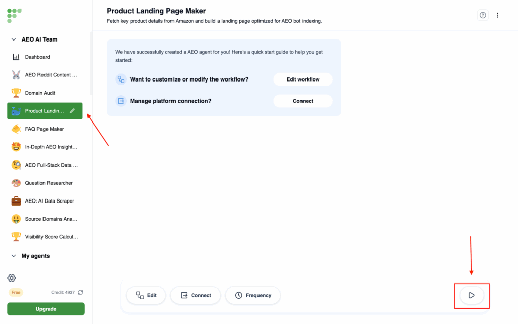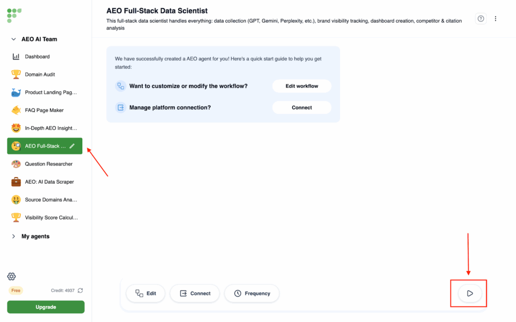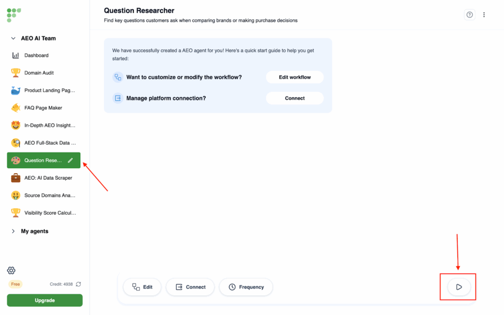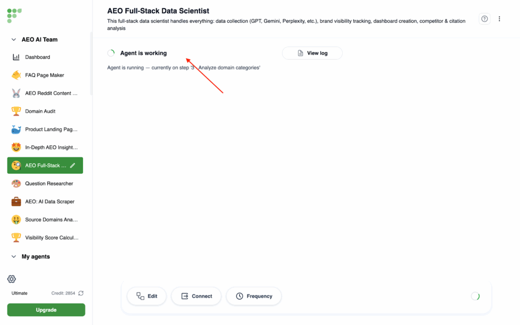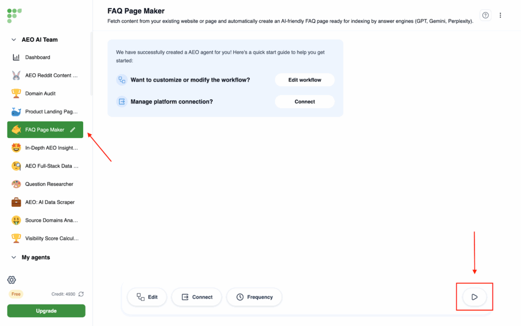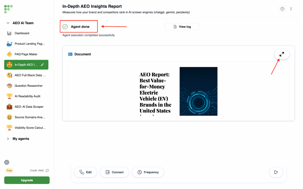 - Click on In-depth AEO report on the left side, then click on Run Agent at the bottom right corner