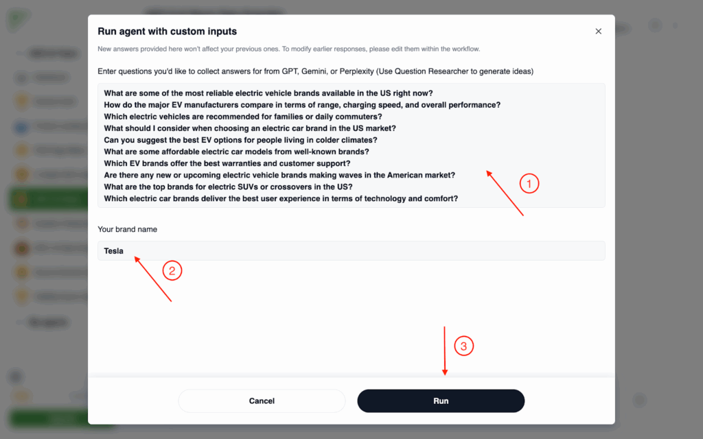 - Type in one question related to your product/service in general. Here, we take Electronic Vehicles as an example. So the question might be: “What are the best value-for-money EV brands in the States? ” Then click Run.