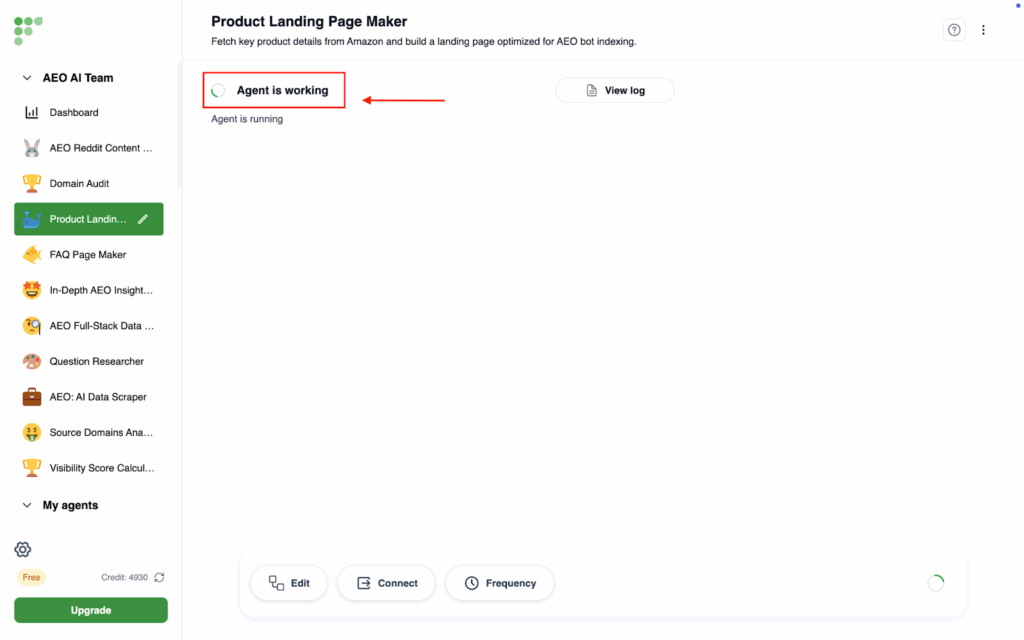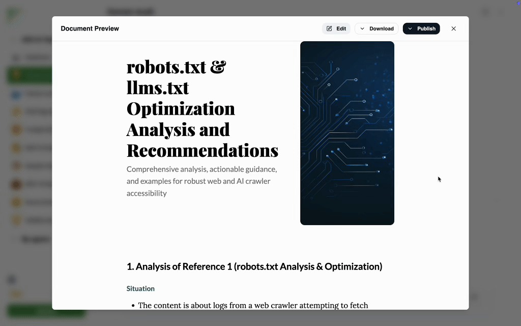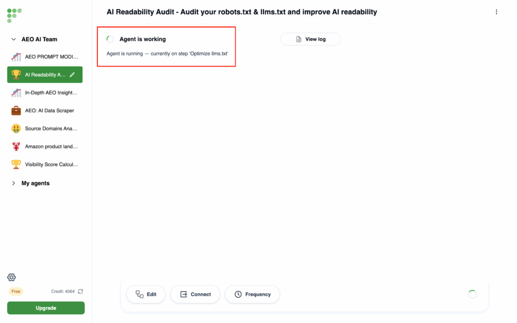 - When it starts running, it will automatically diagnose your Robots.txt and LLMs.txt files and optimize your domain’s accessibility and readability to search engines and AI platforms.