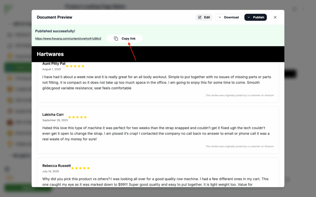 - You can either choose to copy the link and publish on your own community, or publish in Frevana’s community in one click.