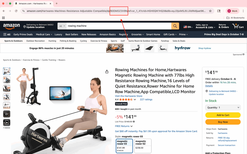 - Then type in your product Amazon code. Here, we take the rowing machine as an example. You can find your product Amazon code in your Amazon link. Then hit Run.