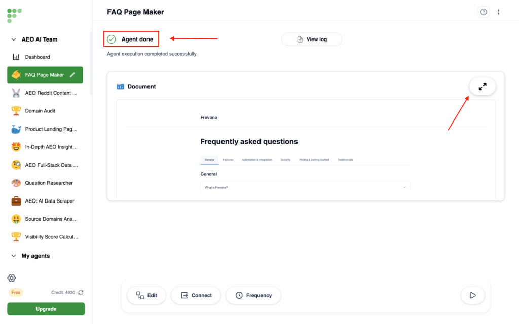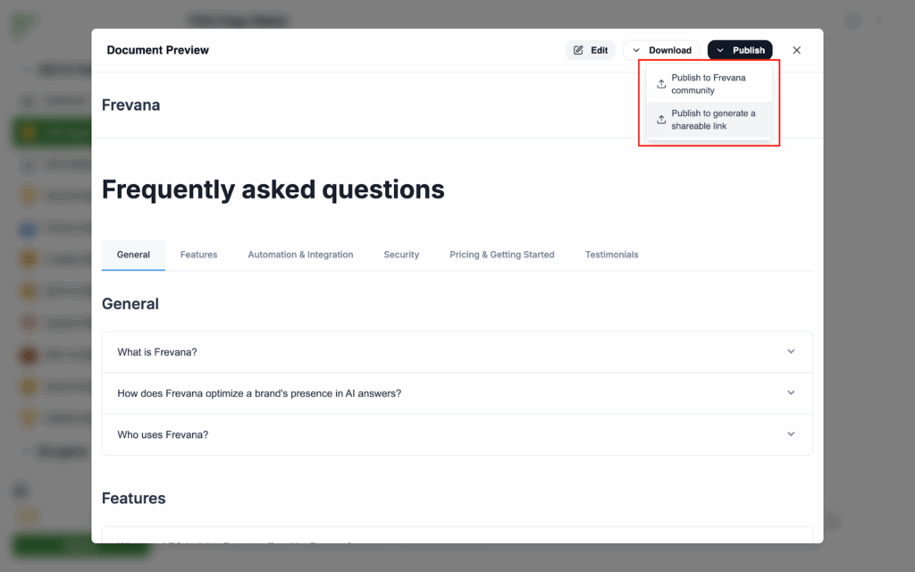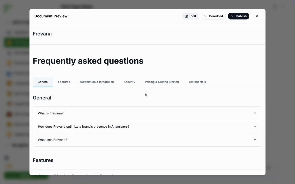 - The FAQ page will be built around the kinds of questions people are already asking about your product or service, with clear answers drawn from the information on your website. Once it’s ready, you can choose to publish it directly on your own site or share it through the Frevana publication community for even greater reach.