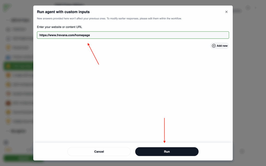 For the optional Related categories or areas, you can either choose to skip, or type in what area you want questions to focus on. Take Frevana for example, if I want to clarify that Frevana is an AI agent for AEO, we could type “AEO”, “workflow automation”, and “AI agent” in the box.